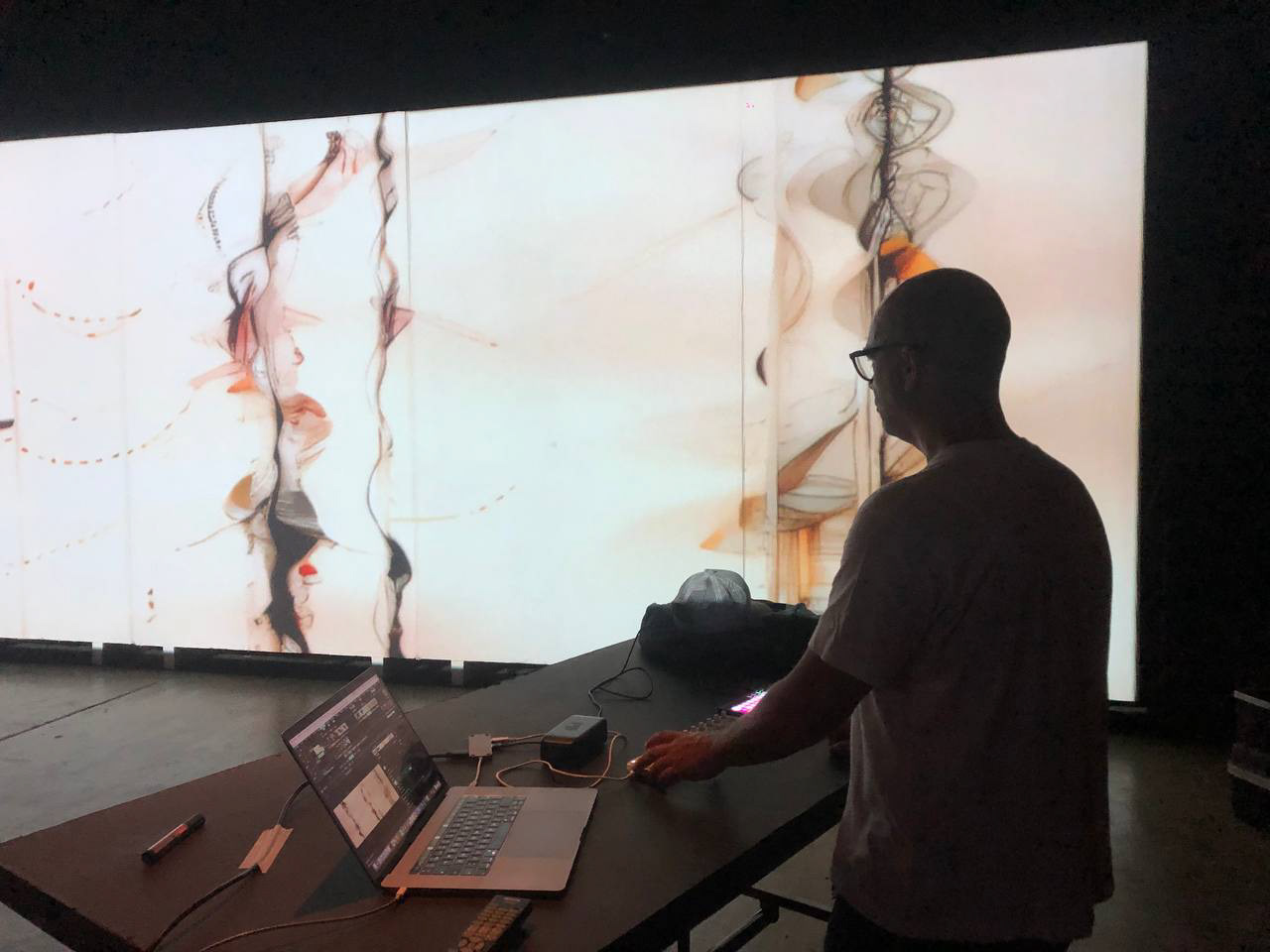 Thanks to the invitation of Javier Bustos and Morita Vargas, I had the opportunity to participate in a live improvisation where sound and visual planes intertwined in real time. While Javier and Morita built hypnotic textures and soundscapes, my visuals dialogued with these proposals on an imposing 9x3 meter screen.